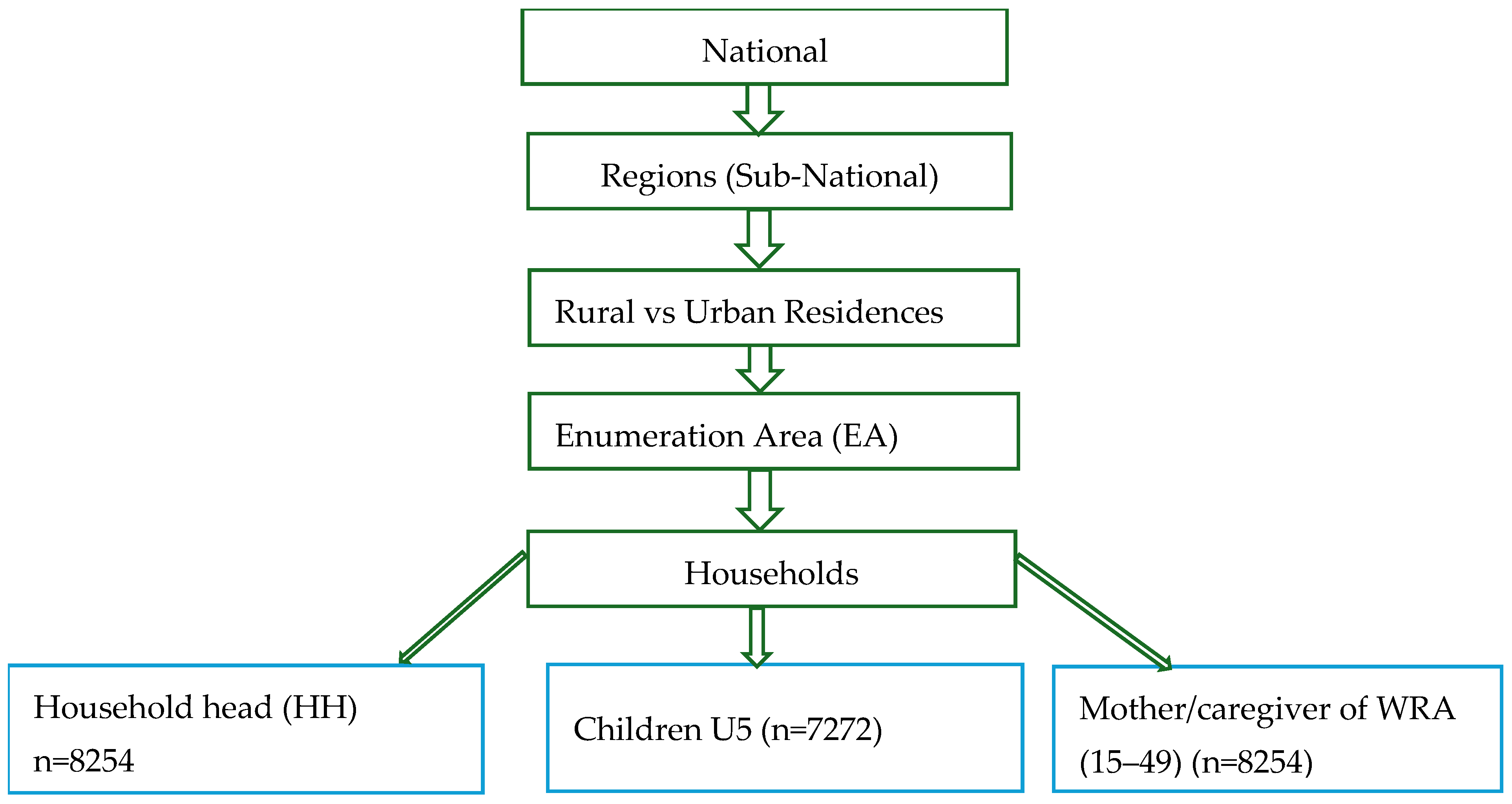 - Woldeyohannes, M.; Girma, M.; Petros, A.; Hussen, A.; Samuel, A.; Dinssa, D.A.; Challa, F.; Laillou, A.; Chitekwe, S.; Baye, K.; et al. Ethiopia National Food and Nutrition Survey to inform the Ethiopian National Food and Nutrition Strategy: A study protocol. BMJ Open 2023, 13, e067641. [Google Scholar] [CrossRef]