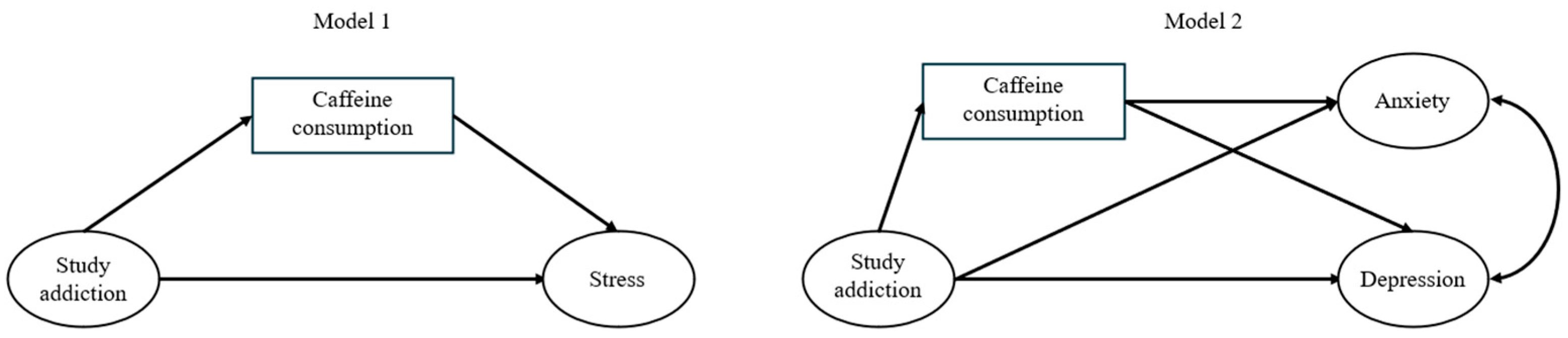 | Study addiction → caffeine consumption → stress | 0.038 ** | [0.014; 0.070] | 0.008 ** | [0.003; 0.014] |