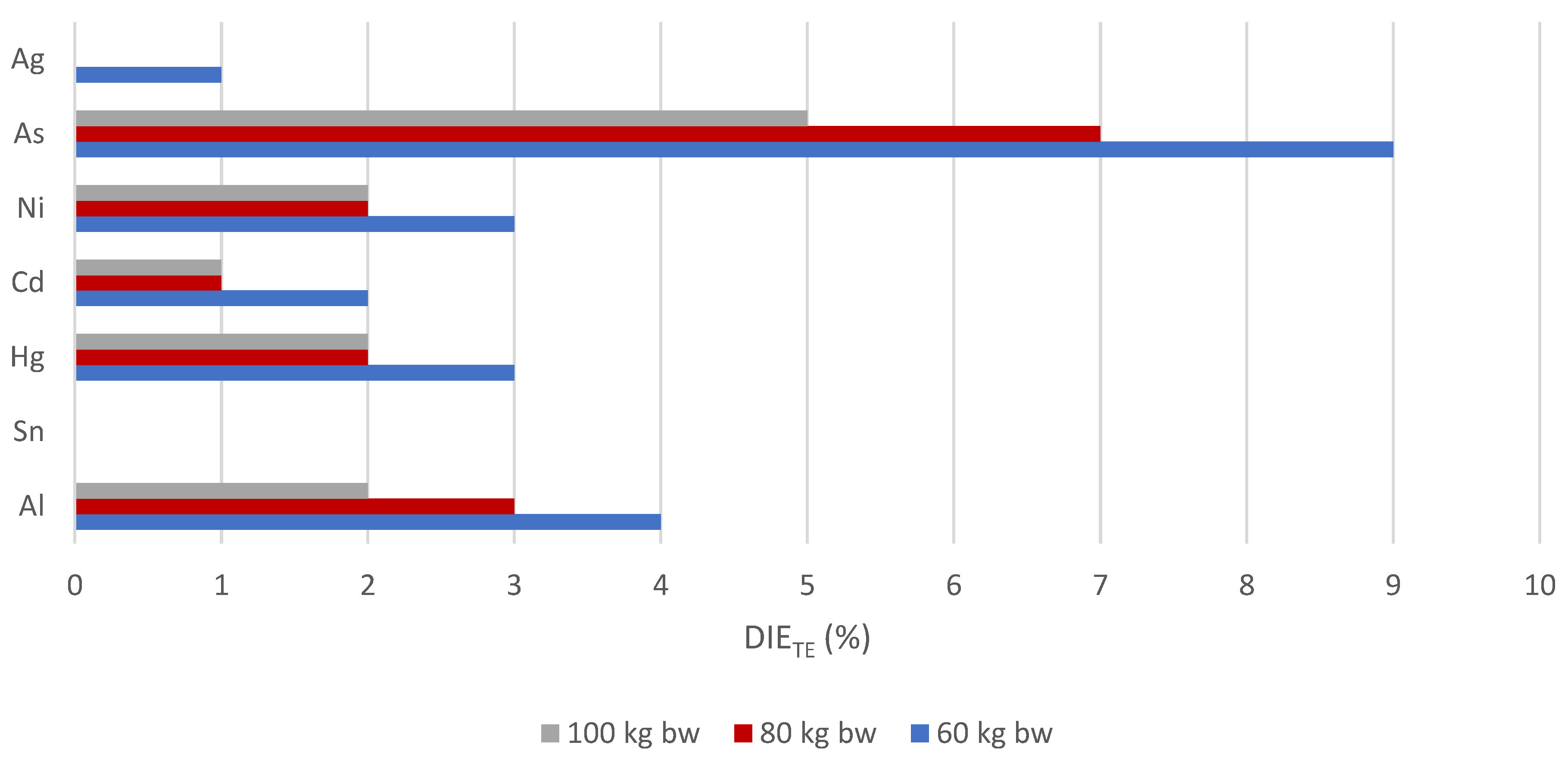 3.4. The Results of Dietary Exposures and Dietary Intake Estimates to Toxic Trace Elements