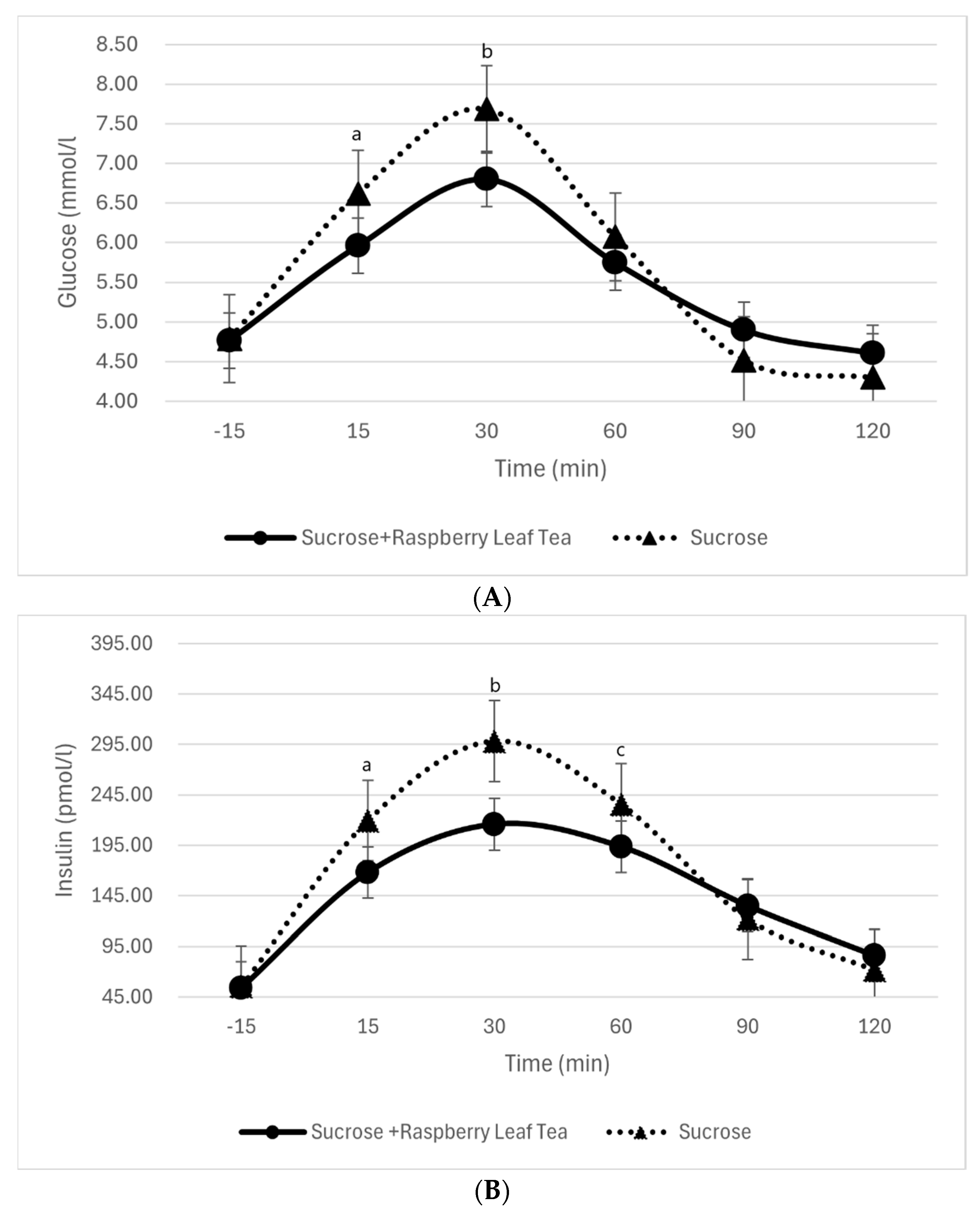 3.3. Blood Glucose and Insulin Levels Before and During Sucrose Intake with or Without RL Tea