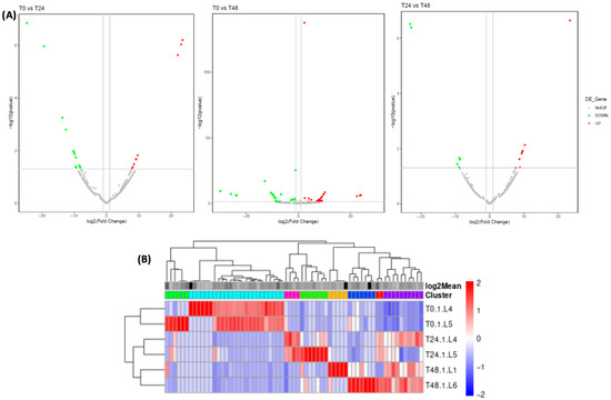 14]. Carrots were rinsed with tap water, disinfected with a chlorine solution (200 ppm, pH 6.5–7.0) for 5 min, then dried with absorbent paper towels. The carrots were peeled by hand and shredded using a mechanical food processor (Waring Commercial, Model WFP11, Torrington, CT, USA) to apply wounding stress. Manual spinning in a salad spinner removed excess moisture from shredded carrots. Samples were stored at 20 ± 2 °C, and subsamples were collected at 24 and 48 h for RNA extraction. All samples were subsequently preserved at −80 °C until total RNA isolation.