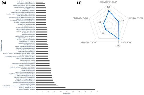 17] and annotated by the Kyoto Encyclopedia of Genes and Genomes (KEGG, Release 114.0, accessed on 19 July 2024) pathways, with redundant pathways manually removed. The pathway was significantly enriched if it passed the count threshold of three genes per annotation term and presented an EASE score with a Benjamini–Hochberg correction set to <0.05. In the DAVID database, the EASE score is a modified Fisher exact