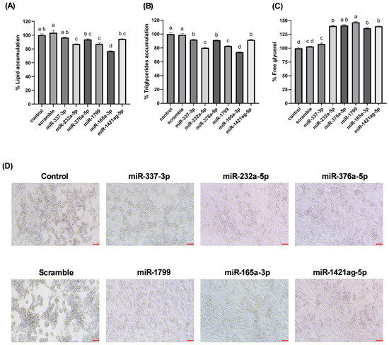 The 3T3-L1 cell line (ATCC, Manassas, VA, USA) was cultured under standard conditions with DMEM with high glucose (Cat. D7777 Merck, Burlington, MA, USA) supplemented with 10% calf serum (Cat. 35-054CM Corning, Corning, NY, USA). The culture was maintained in an incubator at 37 °C and a 5% CO2 atmosphere. The mature plant miRNA mimics novel-hsa-miR-376a-5p UUAGAUUCGCGCACAAACUCmG; novel-oan-miR-1421ag-5p CGGUGGACUGCUUGAGCUGmC; novel-hpo-miR-232a-5p UCCGCAGUAGCACUGGCmU; novel-rno-miR-337-3p UUCAGCUCACAUAUCUCUCUGmG; novel-ath-miR165a-3p UCGGACCAGGCUUCAUUCCCmC; novel-gga-miR-1799 GGAAGUGAUGAGUAGACmU; and a scramble control 5′-GGGACUAGCGGUUAGUGAUAmG-3, synthesized by Integrated DNA Technologies (m denotes 2-O-methylation at the 3′), were transfected into 3T3-L1 cells using the HiPerFect Transfection Reagent (Cat. 301704 Qiagen, Germantown, MD, USA) following manufacturer’s instructions. In brief, 3T3-L1 cells were seeded at a density of 1–2 × 105 cells per well in DMEM supplemented with 10% calf serum and incubated overnight at 37 °C under 5% CO2. After reaching confluency, cells were transfected with 200 pMol/well of miRNA mimics and a scramble control.