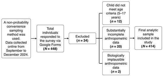 A participant flow diagram is provided in Figure 1. A total of 448 individuals responded to the survey. Participants were excluded if their child did not meet the age criteria (n = 12), if they had substantially incomplete anthropometric data for themselves or their child (n = 20), or if they entered biologically implausible values for anthropometric data (n = 2). After these exclusions, the final analytic sample consisted of N = 414 parents.