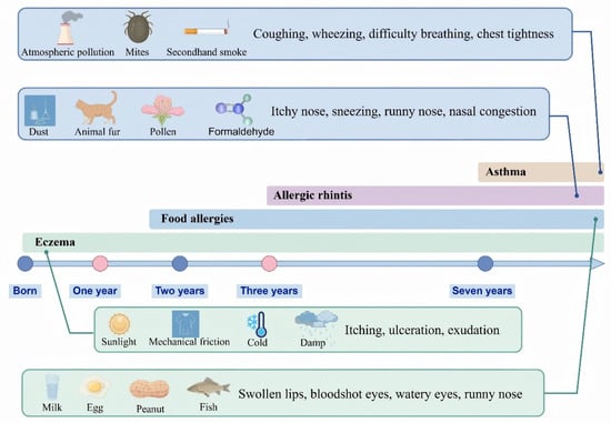 The allergy march and its main causes. The concept of the “allergic march” refers to the progressive sequence of allergic conditions that typically begins with eczema in infancy and may evolve into asthma and allergic rhinitis during childhood. Each of these conditions is influenced by distinct etiological factors. This figure was drawn using Figdraw software (https://www.figdraw.com/).