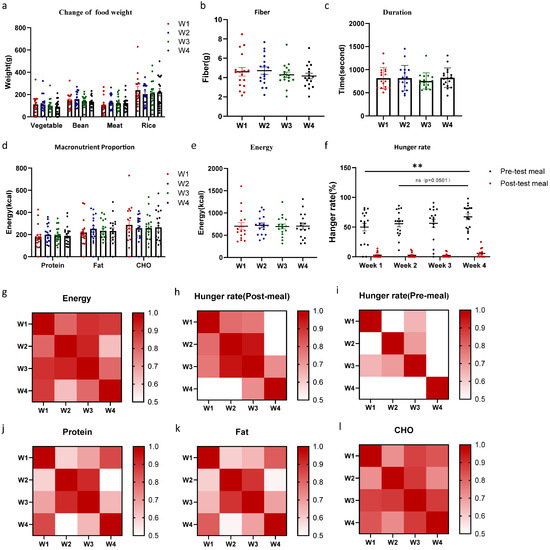 The Feeding Table demonstrated good repeatability in macro indicators and was unaffected by position bias. (a) The impact of trial times on the consumption of different dishes. (b) Variations in fiber intake across different trial times. (c) Variations in meal duration across different trial times. (d) The impact of macronutrients across different trial times. (e) Variations in energy intake across different trial times. (f) Variations in hanger rate across different trial times. Correlation analysis of total energy intake (g), post-meal hunger rate (h), pre-meal hunger rate (i), protein (j), fat (k), and CHO (l) have been shown. Data are presented as mean ± SEM and were analyzed by one-way ANOVA (b,c,e), and two-way repeated-measures ANOVA (a,d,f). ** p < 0.01.