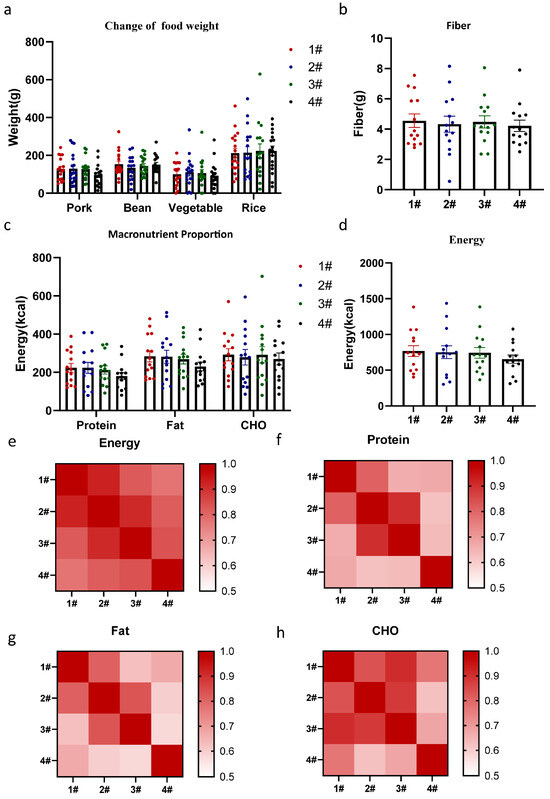 The Feeding Table was unaffected by position bias in macro indicators. (a) The impact of balance numbers on the consumption of different dishes. (b) Variations in fiber intake across different balance numbers. (c) The Impact of macronutrients across different balance numbers. (d) Variations in Energy intake across different balance numbers. Correlation analysis of total energy intake (e), protein (f), fat (g), and CHO (h) have been shown. Data are presented as mean ± SEM and were analyzed by one-way ANOVA (b,d), and two-way repeated-measures ANOVA (a,c). #: Balance number.