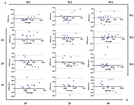 Bland–Altman analysis of energy intake from the location preference experiment. (a) Assessment of agreement in energy intake across varying trial repetitions. (b) Assessment of agreement in energy intake across varying trial repetitions (#: balance number).