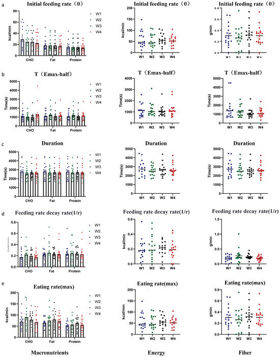 The food table demonstrated good repeatability in the measurement of feeding microstructure parameters (LODE model). (a) The effect of repetition count on the initial feeding rate. (b) The effect of repetition count on the time to reach half of the maximum intake. (c) The effect of repetition count on the duration. (d) The effect of repetition count on the feeding rate decay rate. (e) The effect of repetition count on the max eating rate. Data are presented as mean ± SEM and were analyzed by one-way ANOVA (middle: energy; right: fiber), and two-way repeated-measures ANOVA (left: macronutrients).