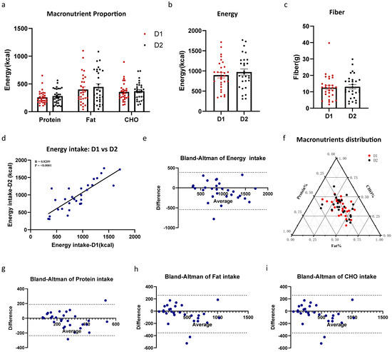 The standard meal demonstrated excellent repeatability in the Feeding Table’s application. (a) The impact of repeated experiments on the following day on the energy contribution ratios of macronutrients. (b) The impact of repeated experiments on the following day on the energy intake. (c) The impact of repeated experiments on the following day on the fiber intake. (d) Linear regression of energy intake D1 vs energy intake D2. The Bland–Altman analysis was conducted to compare energy intake (e), protein (g), fat (h), and carbohydrate (i) between Day 1 (D1) and Day 2 (D2). (f) Ternary plot of macronutrient distribution between Day 1 (D1) and Day 2 (D2). Data are presented as mean ± SEM and were analyzed by t-test (b,c), and two-way repeated-measures ANOVA (a).