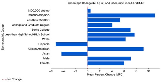 Data analysis was performed using Python (version 3.12) with the stats models library for statistical modeling. Descriptive statistics, including frequencies, percentages, means, and standard deviations, were used to summarize the sample’s demographic characteristics. Paired sample t-tests were conducted to compare mean food security scores before and after the start of the COVID-19 pandemic. Mean percentage change (MPC) was calculated to quantify relative differences. In addition, logistic regression models were applied to identify predictors of food insecurity, with demographic variables such as gender, race, income, and education included as independent predictors. Observations with missing values for race (0.7%), education (0.1%), or income (5.0%) were excluded from the regression models via listwise deletion. Adjusted odds ratios (ORs) with 95% confidence intervals (CIs) were calculated to assess the strength of these associations. All statistical tests were two-tailed, with significance set at p < 0.05. Graphical methods were employed to visualize trends and disparities in food security, enabling a comprehensive understanding of the data.