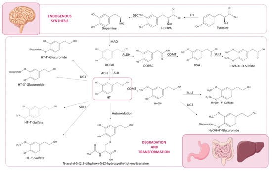 Metabolic Pathways of Hydroxytyrosol: Endogenous synthesis, Biotransformation, and Degradation. Enzymes involved: UDP-glucuronosyltransferases (UGTs), sulfotransferases (SULTs), catechol-O-methyltransferase (COMT), aldehyde dehydrogenase (ALDH), alcohol dehydrogenase (ADH), monoamine oxidase (MAO), aldehyde reductase (ALR),tyrosine hydroxylase (TH), DOPA decarboxylase (DDC). Main metabolites: hydroxytyrosol (HT), homovanillyl alcohol (HvOH), homovanillic acid (HVA), 3′,4′-dihydroxyphenylacetic acid (DOPAC), 3′,4′-dihydroxyphenylacetaldehyde (DOPAL), alcohol derivative of HVA (HvAlc), N-acetyl-5-S-cysteinyl-hydroxytyrosol.