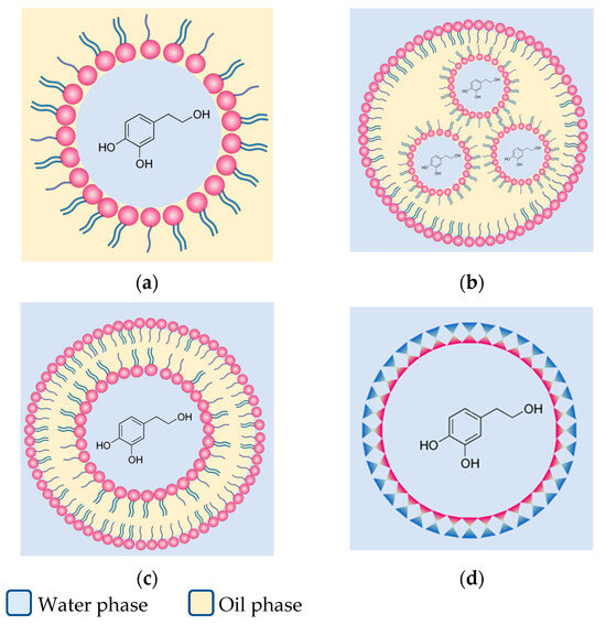 Delivery systems for hydroxytyrosol encapsulation. Schematic representation of (a) water-in-oil (W/O) emulsion, (b) water-in-oil-in-water (W/O/W) double emulsion, (c) liposome, and (d) polymer-based encapsulation system.