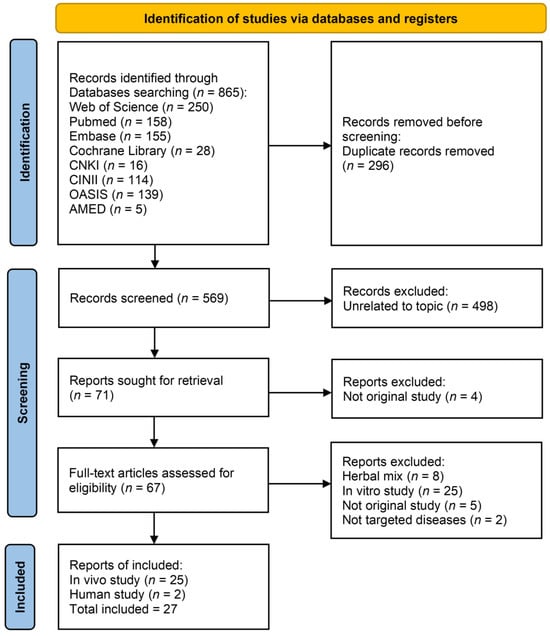 Subsequently, 71 articles were selected for full-text retrieval. Four reports could not be retrieved. The remaining 67 articles underwent full-text evaluation for eligibility. Based on predefined criteria, 8 studies using herbal mixtures (in which the independent effect of Dioscoreae Rhizoma could not be determined), 25 in vitro studies, 5 non-original articles, and 2 studies on non-targeted diseases were excluded.