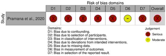 In Liang et al. [12], three participants (two in the intervention group and one in the control group) were lost to follow-up, with reasons for dropout clearly documented. Given the low attrition and transparent reporting, the study was assessed as having a low risk of bias in this domain. In contrast, Pramana et al. [13] initially recruited 69 participants but analyzed data from only 10 (five per group). The reasons for excluding the majority were not adequately explained, and the high exclusion rate raises concerns about bias due to missing data. Therefore, this domain was assessed as having a serious risk of bias under ROBINS-I.