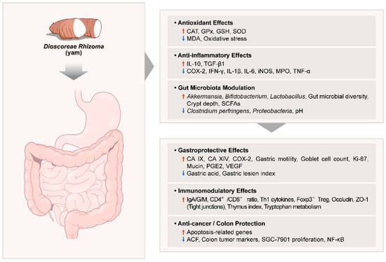 This study reviewed human trials and synthesized a wide range of in vivo studies investigating the therapeutic potential of Dioscoreae Rhizoma in gastrointestinal health. Key findings include gastroprotective effects against ethanol-induced gastric lesions, improvements in gastrointestinal function and motility, and enhanced SCFA production through modulation of gut microbiota and increased populations of beneficial bacteria. Anti-colitic and anti-inflammatory effects were consistently observed in models of colitis, antibiotic-associated diarrhea, pancreatitis, and immune dysfunction, highlighting the immunomodulatory capacity of Dioscoreae Rhizoma. Additionally, chemo-preventive properties were observed through the reduction in colon tumor markers and modulation of apoptosis and inflammatory pathways. Collectively, these studies underscore the multifaceted bioactivity of Dioscoreae Rhizoma, particularly via antioxidant and anti-inflammatory mechanisms, enhancement of the gut barrier, and immune regulation, supporting its clinical relevance in gastrointestinal disorders. A visual summary of the overall mechanisms of Dioscoreae Rhizoma is presented in Figure 4, highlighting the integrated antioxidative, anti-inflammatory, and gut microbiota modulatory pathways.