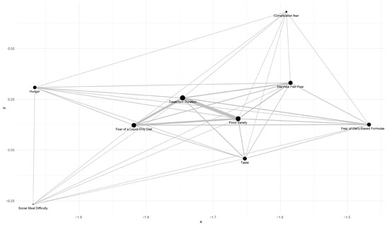 Since barriers can be expected to interact with each other in an uncontrolled environment, we used a network plot for visualization. As shown in Figure 5, the top three barriers associated with EEN reluctance were ‘food variety’, ‘treatment duration’, and ‘fear of having a liquid-only diet’, which correlated with each other.