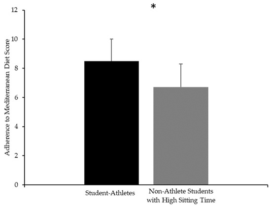 Mean and standard deviation scores of adherence to Mediterranean diet for student-athletes (black) and non-athlete students with high sitting time (gray). * Significant differences between groups (p < 0.05).