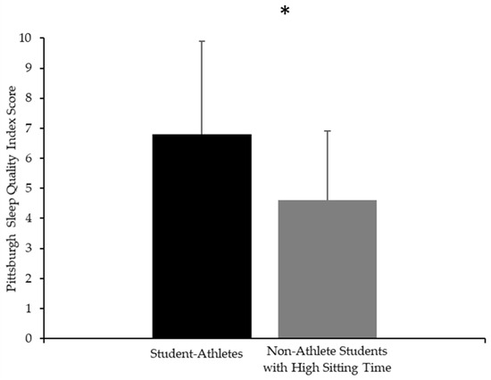 Mean and standard deviation scores of Pittsburgh Sleep Quality Index for student-athletes (black) and non-athlete students with high sitting time (gray). * Significant differences between groups (p < 0.05).