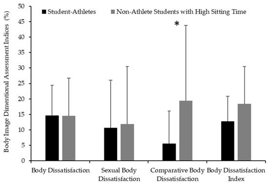 Mean and standard deviation scores of Body Image Dimensional Assessment for student-athletes (black) and non-athlete students with high sitting time (gray). * Significant differences between groups (p < 0.05).