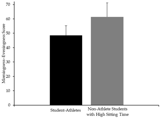 Mean and standard deviation scores of Morningness–Eveningness Questionnaire for student-athletes (black) and non-athlete students with high sitting time (gray).