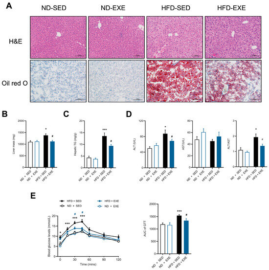 Effects of aerobic exercise on HFD-induced hepatic steatosis and liver injury in mice. (A) Representative images of H&E and Oil Red O staining showing hepatic lipid accumulation (scale bar: 100 μm); (B) Liver mass. (C) Hepatic TG level. (D) Serum ALT and AST levels (U/L) and ALT/AST ratio. (E) Intraperitoneal GTT with blood glucose levels measured at indicated time points (n = 5 per group). Data are presented as mean ± SEM. * p < 0.05, *** p < 0.001 vs. ND + SED group; # p < 0.05 vs. ND + HFD group (two-way ANOVA with Bonferroni post hoc test), n = 5 per group.