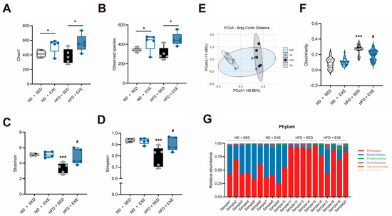 Effects of aerobic exercise on gut microbiota diversity and composition in HFD-fed mice. (A) Observed species richness. (B–D) α-Diversity indices (Chao1, Simpson, and Shannon) at the genus level. ((A–D), Each data point represents one individual sample) (E) Principal coordinate analysis (PCoA) of β-diversity. (F) Inter-group dissimilarity (Bray–Curtis distance). (G) Taxonomic composition at the phylum level (relative abundance of dominant genera). Data are presented as mean ± SEM. * p < 0.05, *** p < 0.001 vs. ND + SED group; # p < 0.05 vs. ND + HFD group (two-way ANOVA with Bonferroni post hoc test), n = 5 per group.