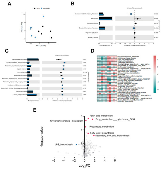 Functional analysis of gut microbiota remodeling by aerobic exercise in HFD-fed mice. (A) PCA plot of OTUs. (B) KEGG pathway enrichment (Level 1 categories). (C) Metabolic pathway alterations (KEGG Level 2). (D) Heatmap of differentially enriched KEGG pathways (Level 3) clustered by the top four Level 2 metabolic categories. (E) Volcano plot highlighting significantly altered KEGG pathways (Level 3) between HFD + SED and HFD + EXE groups, the blue dot means downregulate, and red means upregulate. n = 5 per group.