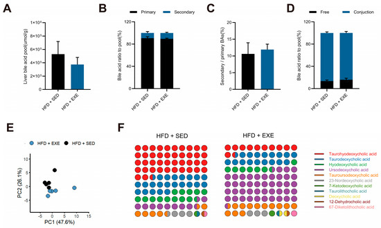 Impact of aerobic exercise on the hepatic bile acid pool in HFD-fed mice. (A) Total hepatic bile acid content. (B) Composition of primary vs. secondary bile acids. (C) Free-to-conjugated bile acid ratio. (D) Free and conjunct bile acid ratio in total hepatic bile acid pool. (E) PCA of hepatic bile acid profiles. (F) Relative abundance of individual secondary bile acids in hepatic bile acid pool. n = 5 per group.