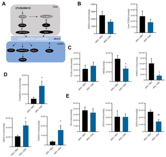 4.2. Effects of Long-Term Exercise Training on Liver Bile Acid Pool in HFD-Fed Mice