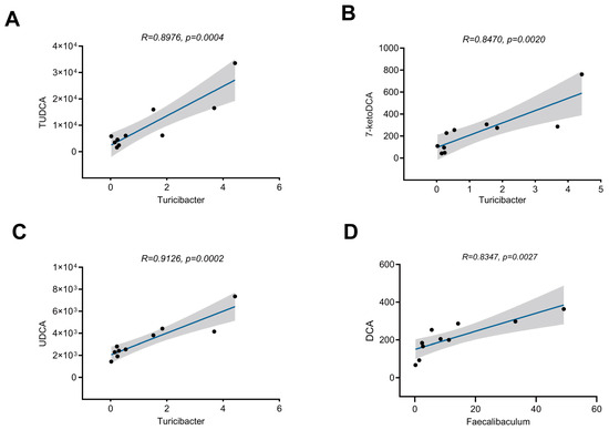 Correlation analysis between secondary bile acid levels and microbiota abundance. (A–C) Spearman correlation between hepatic TUDCA (A), 7-ketoDCA (B), UDCA (C) levels and Turicibacter abundance. (D) Correlation between hepatic DCA levels and Faecalibaculum abundance.