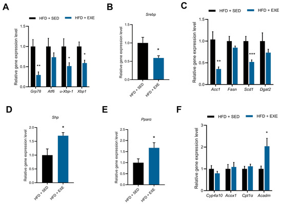 Aerobic exercise regulates hepatic lipid metabolism gene expression through ER stress and FXR-SHP signaling pathway. (A) Hepatic ER stress marker gene expression. (B,C) Lipogenic pathway genes: (B) Srebp1 and (C) its downstream targets. (D) FXR activation marker Shp. (E,F) Fatty acid oxidation genes: (E) Ppara and (F) its targets. Compare with HFD + SED group (t-test), * p < 0.05, ** p < 0.01, *** p < 0.005, n = 5 per group.