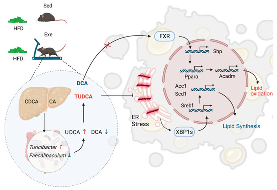 Our findings demonstrate that aerobic exercise changes the gut microbiota composition and enhances its diversity in high-fat diet-fed mice. The observed alterations in the abundance of hepatic secondary bile acids (TUDCA and DCA) were associated with these microbial changes. Furthermore, the exercise-induced modulation of TUDCA and DCA may contribute to the regulation of hepatic lipid metabolism gene expression (Figure 9).