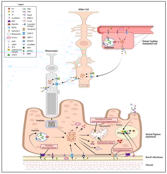 Dietary intake is the primary source of systemic iron for the body, present in heme and non-heme iron forms. Heme iron, derived from animal sources, is absorbed more efficiently in the duodenum compared to non-heme iron found in plant-based products and iron-fortified foods []. Physiologically, iron can enter the retina either through the basolateral membrane of the RPE, via the choroid, or through the Müller cells, via the retinal capillaries []. The RPE also acquires iron through the phagocytosis of photoreceptor outer segments, which then enters the labile iron pool (LIP), where it is stored in either cytoplasmic or mitochondrial ferritin []. This ferritin also acts as an antioxidant by oxidizing Fe2+ iron to its less reactive Fe3+ form and sequestering it, thereby preventing the generation of free radicals and oxidative damage through the Fenton reaction []. As detailed in Figure 1, for transferrin-bound iron (TBI)-mediated import, the basolateral membrane of the RPE expresses both high affinity transferrin receptor 1 (TfR1) and lower affinity transferrin receptor 2 (TfR2), which facilitate the uptake of two ferric (Fe3+) ions bound to transferrin (Tf) through receptor-mediated endocytosis [,]. Within the acidic environment of the endosome, the transferrin-iron complex dissociates from the TfR, releasing the two Fe3+ ions. The metalloreductase enzyme, six-transmembrane epithelial antigen of the prostate 3 (STEAP3), located in the endosome, reduces Fe3+ to soluble Fe2+ iron, which then exits the endosome via the divalent metal transporter 1 (DMT1) and enters the LIP in the cytosol []. On the contrary, during non-transferrin-bound iron (NTBI) uptake, the solute carriers SLC39A8 and SLC39A14 (Zrt- and Irt-like proteins, Zip8/14) facilitate Fe2+ import []. The scavenger receptor class A member 5 (Scara5) binds to serum light chain L-ferritin and mediates ferritin bound iron uptake, a function well-established in endothelial cells []. Although Scara5 is also expressed in RPE, its role in ferritin uptake in RPE remains unclear []. The lipocalin 2 receptor, 24p3R (SLC22A17) contributes to iron uptake by mediating endocytosis of lipocalin 2-siderophore-iron complexes []. Retinal capillary endothelial cells, like RPE, express TfR1, Scara5, and Zip8/14, supplying iron to the Müller cells and photoreceptors []. Ferroportin, expressed in all these cell types, exports Fe2+ from the cells []. The ferroxidases, hephaestin (HP) and ceruloplasmin (CP), are involved in converting the Fe2+ to Fe3+ during iron export []. To maintain systemic iron balance, the homeostatic iron regulator (HFE) protein interacts with TfR1 or TfR2 depending on the iron status []. In conditions of excess or sufficient iron, increased transferrin saturation competitively displaces HFE from TfR1, allowing HFE to bind TfR2 and activate pSMAD1/5/8-SMAD4 signaling, which promotes hepcidin production. Hepcidin in turn binds to ferroportin and limits further iron export into the circulation [,]. Inflammation induced interleukin IL-6 can also activate hepcidin expression, albeit through the signal transducer and activator of transcription 3 (STAT3) pathway []. Additionally, hemojuvelin (HJV), a key iron-regulatory protein, exists in soluble (sHJV) and membrane-associated (mHJV) forms, with inverse roles in regulating bone morphogenic protein (BMP) and its receptor (BMP-R). When mHJV is bound to BMP-BMP-R complexes, it promotes hepcidin expression, whereas sHJV inhibits hepcidin expression by binding to BMP ligands and preventing them from interacting with mHJV-BMP-R complexes on the membrane []. The melanosomes in the RPE can sequester free Fe2+ ions, protecting the tissue from oxidative stress and iron-induced damage []. Similarly, 2,5-DHBA, a siderophore synthesized by BDH2, binds Fe3+ in the RPE []. Lactoferrin in the RPE also binds Fe3+, contributing to the RPE’s defense mechanisms against oxidative stress [].