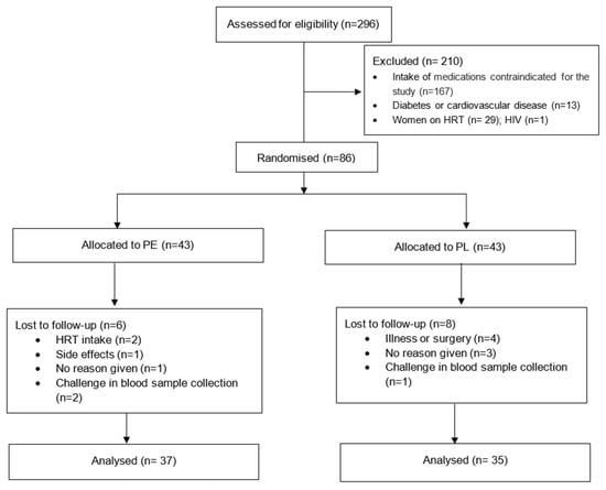 The advertisement led to 355 individuals expressing interest, of whom 296 were assessed for eligibility and 86 met the eligibility criteria for participation. These participants were equally assigned to the PE and PL groups. Eight participants withdrew after their initial appointment, leaving 76 who completed the full intervention. In some cases (n = 4), challenges with blood collection during specific appointments resulted in incomplete data for certain participants. Consequently, 72 participants completed data from all three appointments and were included in the final analysis. The overall attrition rate was 11.6%. The CONSORT flow diagram has included in Figure 1.