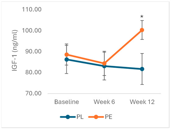 After excluding outliers (n = 2), data was normally distributed. Analysis showed a significant effect of treatment and time on IGF-1 levels (F2,136 = 3.43, p = 0.04). In the PE group, IGF-1 levels increased significantly by 14.09 ng/mL (SE = 6.87, p = 0.02) at week 12, with no significant changes observed at week 6. No significant changes were detected in PL group at either time point (Figure 2).