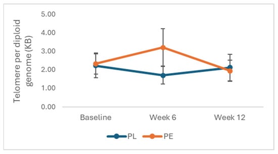Effects of PE on telomere length. Data is expressed as mean (SE) and analysed using repeated measures ANOVA after logarithm transformation of data. Abbreviations: PE: pomegranate extract; PL: placebo.