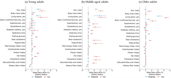 In young adults (Figure 2a and Table S1), males were more likely to belong to the Moderate adherence (OR = 2.02, 95% CI: 1.69–2.41) and Low adherence groups (OR = 2.59, 95% CI: 2.14–3.12) compared to females. Living alone was associated with higher odds of being in the Moderate adherence (OR = 1.82, 95% CI: 1.39–2.39) and Low adherence groups (OR = 2.46, 95% CI: 2.01–3.57). Sedentary time was significantly longer in the Low adherence groups (OR = 1.20, 95% CI: 1.08–1.11), and fasting glucose was higher (OR = 1.71, 95% CI: 1.53–1.91). In terms of nutrient intake, the Low adherence groups exhibited higher total energy intake (OR = 1.43, 95% CI: 1.28–1.61), protein intake (OR = 1.99, 95% CI: 1.69–2.13), fat intake (OR = 1.55, 95% CI: 1.39–1.93), and lower dietary fiber intake (OR = 0.65, 95% CI: 0.55–0.71) than the High adherence groups.