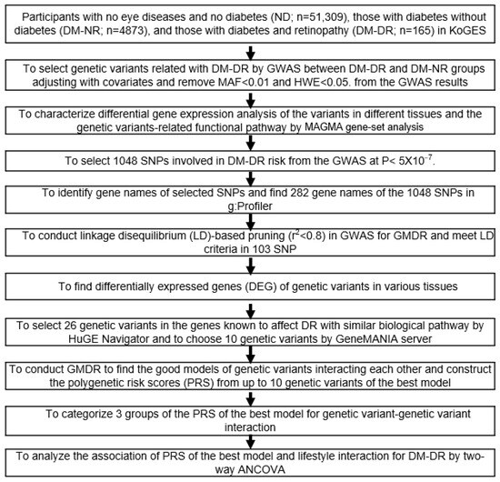 Flowchart for analyzing genetic and lifestyle interactions for diabetic retinopathy association in the Korea Genome Epidemiology Study (KoGES) cohort. GWAS analysis was conducted between diabetic patients without retinopathy (DM-NR) and diabetic patients with retinopathy (DM-DR) groups using two covariate adjustment models: Covariates 1 (red squares): age, gender, body mass index, and diabetic duration; Covariates 2 (blue squares): extended adjustment including residence area, waist and hip circumferences, hypertension status, lipid profiles, estimated glomerular filtration rate, smoking, alcohol intake, physical activity, and medications (lipid-lowering, antihypertensive, and antidiabetic). Abbreviations: SNP, single-nucleotide polymorphism; GWAS, genome-wide association study; MAF, minor allele frequencies; MAGMA, Multi-marker Analysis of GenoMic Annotation; HWE, Hardy–Weinberg equilibrium; GMDR, generalized multifactor dimensionality reduction; HuGE, Human Genome Epidemiology; ANCOVA, analysis of covariance.