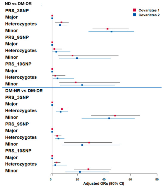 Adjusted odds ratios (OR) and 95% confidence intervals (CI) for polygenic risk score (PRS) associations with diabetic retinopathy risk. Three PRS models (3-, 9-, and 10-genetic variants) were constructed using GWAS and GMDR analysis. PRS stratification: Major = high-risk group (highest number of risk alleles); Minor = low-risk group (lowest number of risk alleles); Heterozygotes = intermediate risk. Upper panel: Non-diabetic controls (ND) vs. diabetic retinopathy patients (DM-DR) groups. Lower panel: Diabetic patients without retinopathy (DM-NR) vs. DM-DR groups. Color coding: red squares indicated adjusted OR in adjusted logistic regression with covariates 1 adjustment (age, gender, bodu mass index, diabetic duration); blue squares indicated adjusted OR in adjusted logistic regression with covariates 2 adjustment (extended model including residence area, waist/hip circumferences, hypertension, lipid profiles, estimated glomerular filtration rate, smoking, alcohol, physical activity, medications).