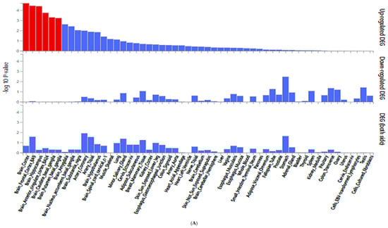 Figure 3A presents differential gene expression (DEG) analysis across 54 tissue types from the Genotype-Tissue Expression (GTEx) v8 dataset, focusing on DM-DR-associated genetic variants. Brain-related tissues (particularly cortex, frontal cortex, hippocampus, anterior cingulate cortex, and caudate and putamen basal ganglia) highlighted in red and exhibited the most significant upregulated gene expression. The results suggested a potential association of brain tissues with the pathophysiology of diabetic retinopathy. In contrast, down-regulated genes and combined up- and down-regulated DEG showed lower significance across tissues (Figure 3A). Other tissues, including metabolic and vascular-related tissues, exhibited limited differential expression patterns.