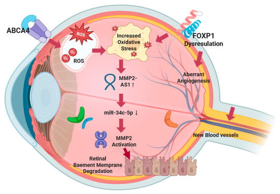 This figure illustrates the convergent molecular pathways underlying diabetic retinopathy pathogenesis through three-way gene interactions. ABCA4 dysfunction leads to the accumulation of toxic retinal aldehydes and an increase in oxidative stress (ROS), thereby creating a pro-inflammatory microenvironment. Simultaneously, FOXP1 dysregulation contributes additional oxidative stress through vascular endothelial dysfunction and impairs the negative regulation of pathological angiogenesis, leading to unopposed VEGF signaling and aberrant neovascularization. This dual oxidative stress environment, resulting from both ABCA4 and FOXP1 dysfunction, synergistically upregulates MRPS33_rs1533933-AS1 expression, which functions as a competitive endogenous RNA by sequestering miR-34c-5p, thereby preventing microRNA-mediated inhibition of MMP2 mRNA expression. The resulting increase in MMP2 protein levels and enzymatic activity leads to degradation of retinal capillary basement membrane components (type IV collagen, laminin, fibronectin), compromising blood–retinal barrier integrity. The degraded basement membrane, combined with FOXP1-mediated dysregulation of angiogenic repair mechanisms, provides a permissive environment for abnormal new blood vessel formation characteristic of proliferative diabetic retinopathy. This convergent mechanism creates a positive feedback loop where inadequate vascular repair maintains ischemic conditions, perpetuating oxidative stress from multiple sources, sustaining MMP2-AS1 upregulation, and causing further vascular compromise.