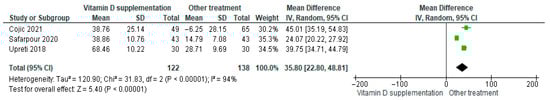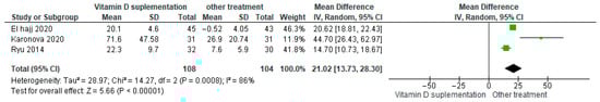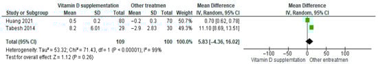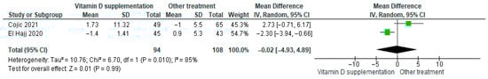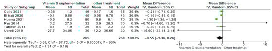 | Sadiya et al., 2015 [37] | United Arab Emirates | CG: 42 EG: 45 | CG: 48 ± 8 EG: 49 ± 8 | CG: They received starch capsules EG: 3000 IU/day of oral vitamin D | It was divided into two phases of 3 months each. In phase 1, group D (n = 45) received unlabeled oral vitamin D at 6000 IU/day, while group P (n = 42) received placebo capsules. In phase 2, group D (n = 45) received 3000 IU/day of oral vitamin D and group P (n = 42) continued on matching placebo capsules. Participants were advised to maintain their usual medical care and diets and to avoid taking calcium or vitamin D supplements on their own during the study period | yeah | 6 months | Does not report |