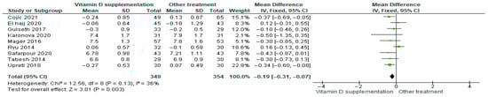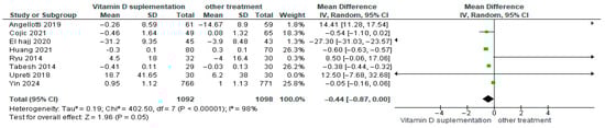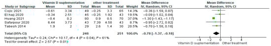 | El Hajj et al., 2020 [49] | Lebanon | CG:43 EG:45 | 66.3 (±4.4) years | CG: Placebo Pill EG: Vitamin D supplement | CG: placebo pill three times a week for 6 months EG: received 30,000 IU of cholecalciferol per week (three doses of 10,000 IU per week) for a period of 6 months | 25(OH)D (ng/mL) BMI (kg/m2) Waist circumference (cm) Body fat (%) Systolic BP (mmHg) Diastolic BP (mmHg) TG (mg/dL) TC (mg/dL) HDL-C (mg/dL) LDL-C (mg/dL) FBG (mg/dL) HbA1c (%) HOMA-IR PTH (ng/L) | 6 months | 25(OH)D (ng/mL) p < 0.0001 BMI (kg/m2) p < 0.0001 Waist circumference (cm) p = 0.0001 Body fat (%) p = 0.05 Systolic BP (mmHg) p = 0.34 Diastolic BP (mmHg) p = 0.21 TG (mg/dL) p = 0.02 TC (mg/dL) p = 0.38 HDL-c (mg/dL) p = 0.022 LDL-c (mg/dL) p = 0.18 FBG (mg/dL) p = 0.84 HbA1c (%) p = 0.31 HOMA-IR p = 0.26 PTH (ng/L) p < 0.0001 |