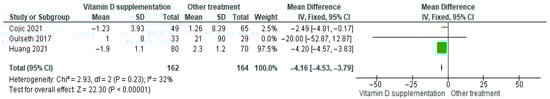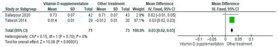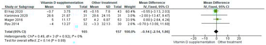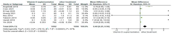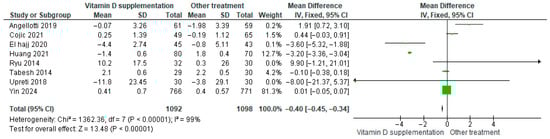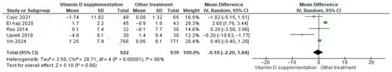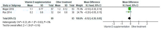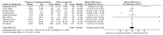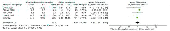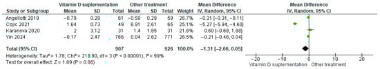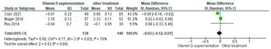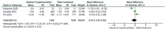 | Yin et al., 2024 [28] | China | CG: 771 EG: 766 | 28.5 years average | CG: 400 IU/d vitamin D3 EG: 1600 IU/d vitamin D3 | CG: serum 25(OH)D concentration <75 nmol/L at a dose of 400 IU/day EG: serum 25(OH)D concentration <75 nmol/L at a dose of 1600 IU/day | HDLC, mmol/L LDLC, mmol/L TC, mmol/L TG, mmol/L CRP, mg/L TNF-a, pg/mL Il-6, pg/mL IL-1β, pg/mL E-Selectin, ng/mL ICAM, ng/mL SBP, mmHg DBP, mmHg TyG | 2 months | HDLC, mmol/L p = 0.01 LDLC, mmol/L p = 0.69 TC, mmol/L p = 0.20 TG, mmol/L p = 0.35 CRP, mg/L p = 0.11 TNF-a, pg/mL p = 0.09 Il-6, pg/mL p = 0.26 IL-1 β, pg/mL p = 0.45 E-Selectin, ng/mL p = 0.28 ICAM, ng/mL p = 0.17 SBP, mmHg p = 0.25 DBP, mmHg p = 0.32 TyG p = 0.61 |