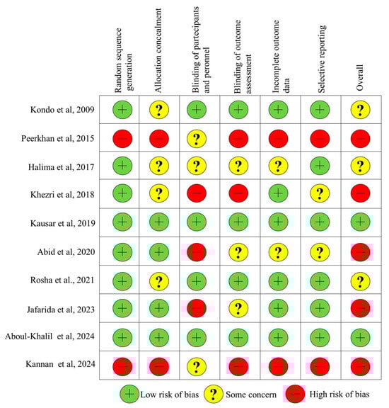 - Higgins, J.P.T.; Altman, D.G.; Gotzsche, P.C.; Juni, P.; Moher, D.; Oxman, A.D.; Savovic, J.; Schulz, K.F.; Weeks, L.; Sterne, J.A.C.; et al. The Cochrane Collaboration’s Tool for Assessing Risk of Bias in Randomised Trials. BMJ 2011, 343, d5928. [Google Scholar] [CrossRef]
