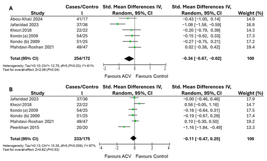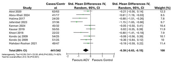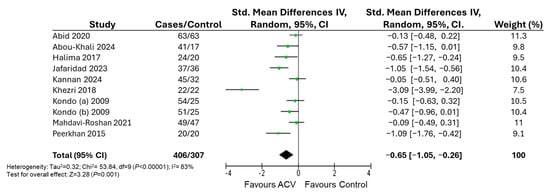 | Control | Water | 353 | −0.37 [−0.63, −0.11] | 26 | 0.006 | |