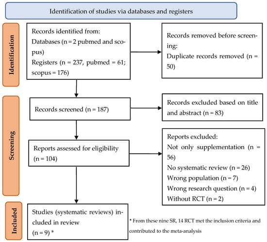 Out of 237 eligible articles, 104 articles were read in full (PRISMA Figure 1). Finally, nine SRs were included in the review reporting (Table 2). From these, 14 trials met the inclusion criteria and contributed to the meta-analyses.