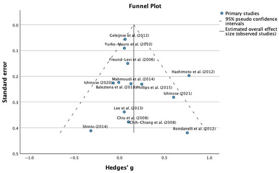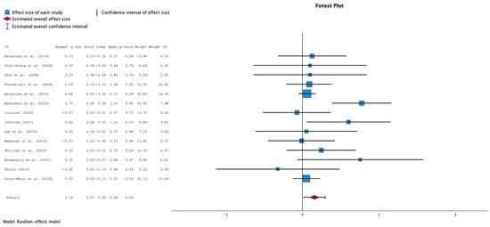 This meta-analysis shows a statistically significant overall positive effect of supplementation intervention. The forest plot (Figure 2) reveals the individual study effect sizes and their respective confidence intervals, providing a comprehensive visualization of the evidence base. The analysis included 14 individual studies, with effect sizes ranging from negative values in some studies (Ichinose 2020 [36]: −0.07, Shinto 2014 [42]: −0.32) to strongly positive effects in others (particularly Hashimoto et al. 2012 [35] showing the largest positive effect).