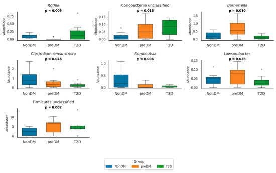 In preDM, the abundance of Firmicutes unclassified was significantly higher compared to NonDM (p = 0.014) and T2D (p = 0.012) groups. Conversely, Romboutsia was already significantly reduced in preDM compared to NonDM (p = 0.010) and further decreased in T2D (p < 0.001) was significantly reduced in preDM compared to NonDM (p = 0.010) and further decreased in T2D (p < 0.001). Lawsonibacter abundance was also significantly lower in T2D compared to preDM (p = 0.030). In contrast, Alphaproteobacteria unclassified was significantly enriched in preDM compared to NonDM (p = 0.004), while Granulicatella showed a decreasing trend in preDM that reversed in T2D (p = 0.027).